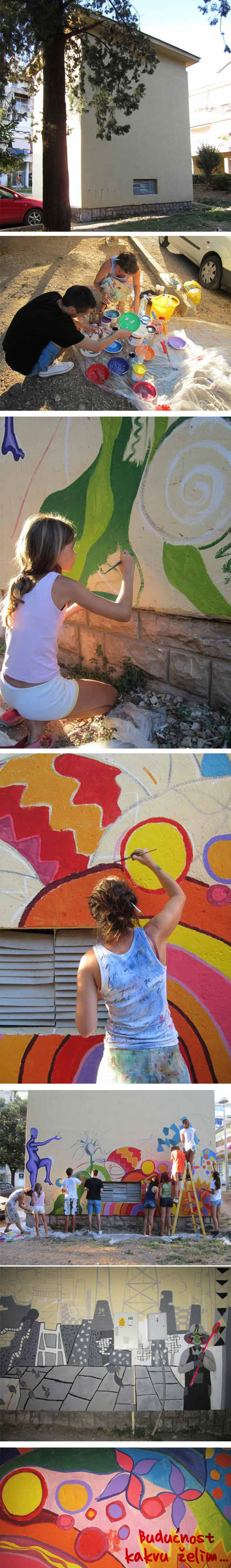 After the competition under the theme: "The Future We Want", and the preparation workshop in Herceg Novi, works on painting murals on the less attractive wall surfaces in the Boka Bay began. The first action of painting the mural took place in the children's park in Tivat, on the transformer station. Reactions of children, citizens and visitors were very positive. Mural painting continues throughout August.