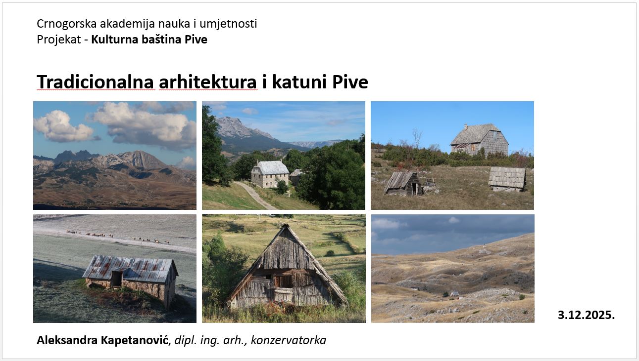 Na prezentaciji su predstavljeni rezultati dosadašnjih istraživanja svih segmenata bogate i slojevite kulturne baštine Pive, od praistorije do kraja XX vijek, koji će biti obrađeni u monografskoj publikaciji. Aleksandra Kapetanović je na prezentaciji predstavila dio istraživanja koji se odnosi na tradicionalnu arhitekturu Pive, sa posebnim fokusom na katune.