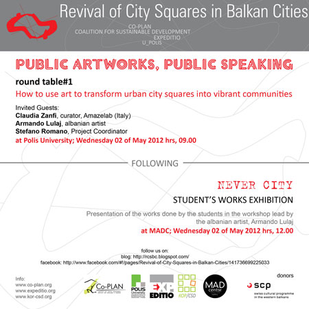 Within the project Revival of Town Squares in Balkan Towns, the first in line of the round tables in Albania is organized at the Polis University in Tirana on May 2, 2012 under the title “Public Artworks, Public Speaking”.